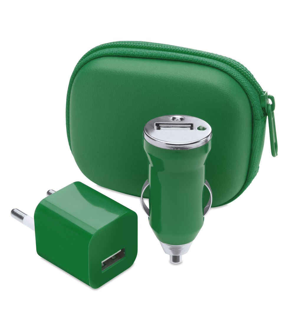 Set de cargadores USB para coche, con LED indicador de carga, y pared, de 1.000 mA de capacidad de carga y en divertidos colores. Presentados en desenfadado y resistente estuche de polipiel a juego.